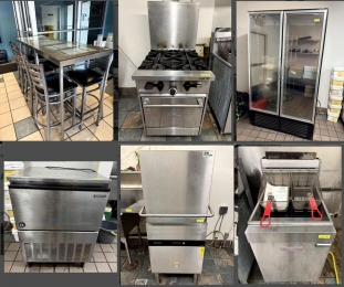 Highlights: Krupps K1100E-A Door-Type Dishwasher, Traulsen G20010 S/S Cooler, IFI 2-Door Glass Merchandiser, Hoshizaki AM-150BAF Ice Machine, Garland 4-burner Gas Range, Vulcan LG300 Gas Fryer, Two Well Stainless Steel Sink, Omcan 12" Meat Slicer, True 72" Mega-Top Prep Table, dining tables, chairs, chef tools, and so much more!